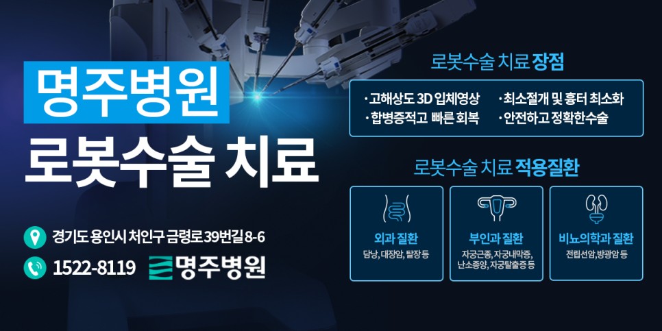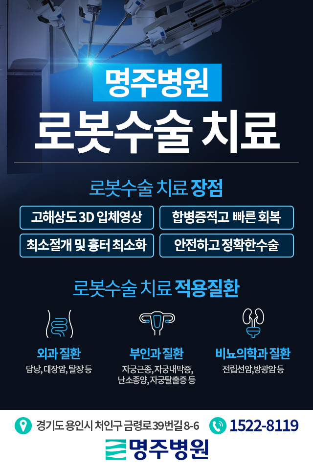 | 자궁근종 원인 증상 검사 및 수술치료 - 용인 명주병원 로봇수술치료 (1) | 2024.01.22 |