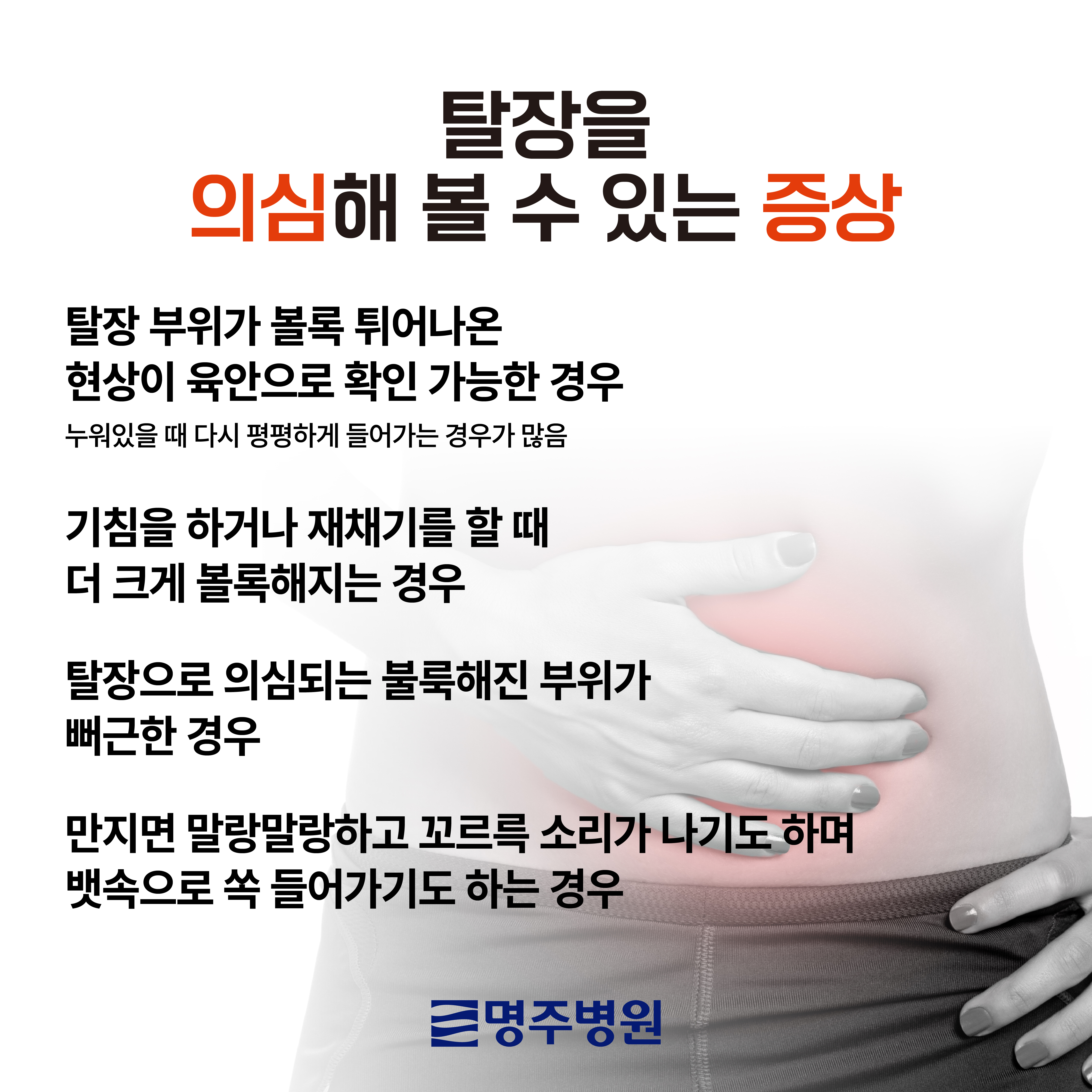 탈장 증상은 원인과 발생 부위에 따라 다르며, 대부분 초기에는 작게 돌출되며, 대부분 큰 통증과 불편감은 없지만, 탈장이 점차 진행되면서 약해진 복벽 내부 내용물의 압력이 높아지고 덩어리의 크기가 커지게 되면 언제든지 장기의 손상이 진행될 수가 있습니다.