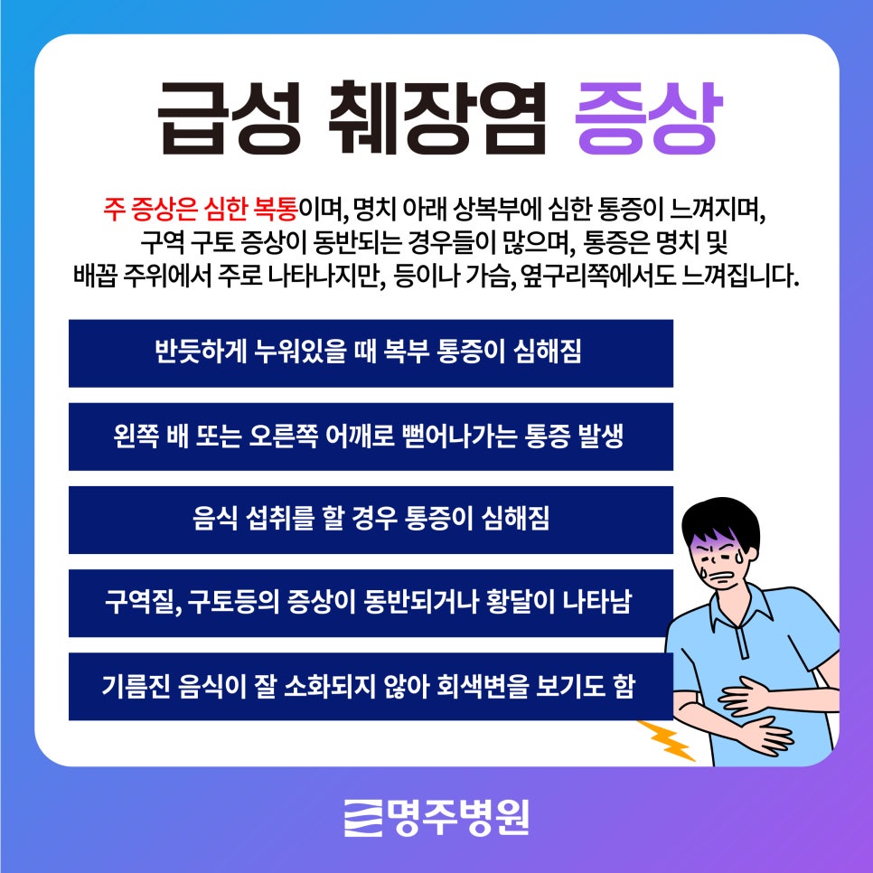급성 췌장염은 마약성 진통제가 필요할 정도로 매우 심한 복통을 동반하는 것이 특징으로, 이 외 염증반응에 의한 발열, 오한 및 오심, 구토 증상이 동반될 수가 있으며, 중증인 경우 의식저하나 호흡곤란이 발생하기도 합니다.