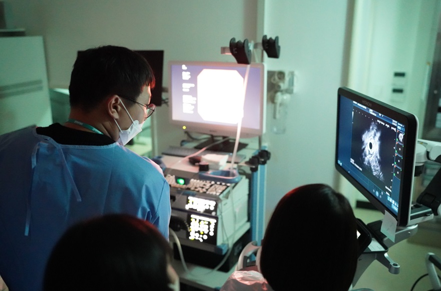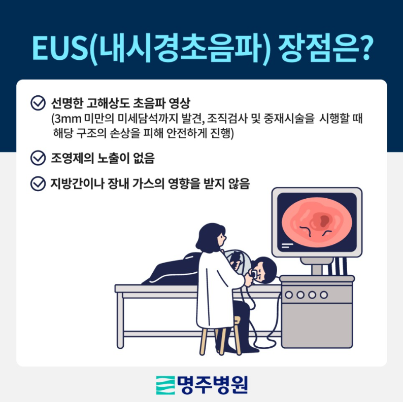 초음파 내시경을 이용, 장관내 공기, 복벽의 피하지방, 뼈 등의 영향을 받지 않아 일반적인 복부 초음파와 달리 시야를 제한받지 않고 췌장이나 담낭, 담관을 훨씬 선명하게 관찰할 수가 있습니다.
