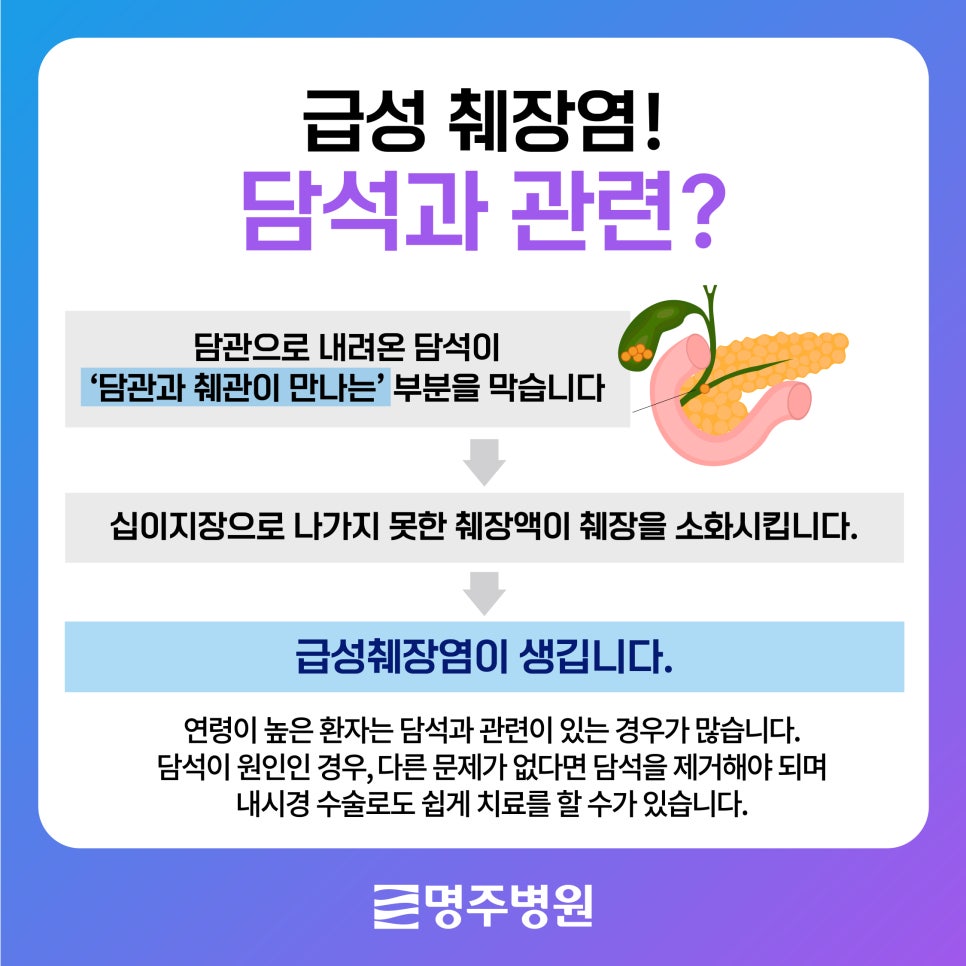 급성 췌장염을 불러 일으키는 원인으로 담석을 들 수 있으며, 담석이 담췌관 말단 부위 오디 괄약근에 박혀 췌장액 배출을 막게 되면, 고여있는 췌장액이 췌장세포를 손상시켜 급성 췌장염을 유발하다보니 담석이 췌장액의 흐름을 방해하여 췌장암이 진행된 경우, 내시경을 통해 조기에 담석을 제거해야 합니다.