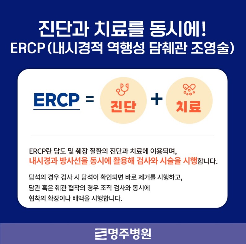 내시경적 역행성 담췌관조영술(ERCP)는 일반적인 위, 대장 내시경과 달리 십이지장경과 방사선 투시기를 이용, 십이지장 유두부를 통해 담관 및 췌관을 조영하고 검사하는 시술방법으로 주로 담석으로 인한 급성 담관염이 발생시 활용되며, 담석으로 인한 급성 췌장염, 담관암, 췌장암과 같은 악성 종양의 조직 검사등에도 활용되며, 담도계 및 췌장과 관련된 질환의 진단 및 치료에 필요합니다.